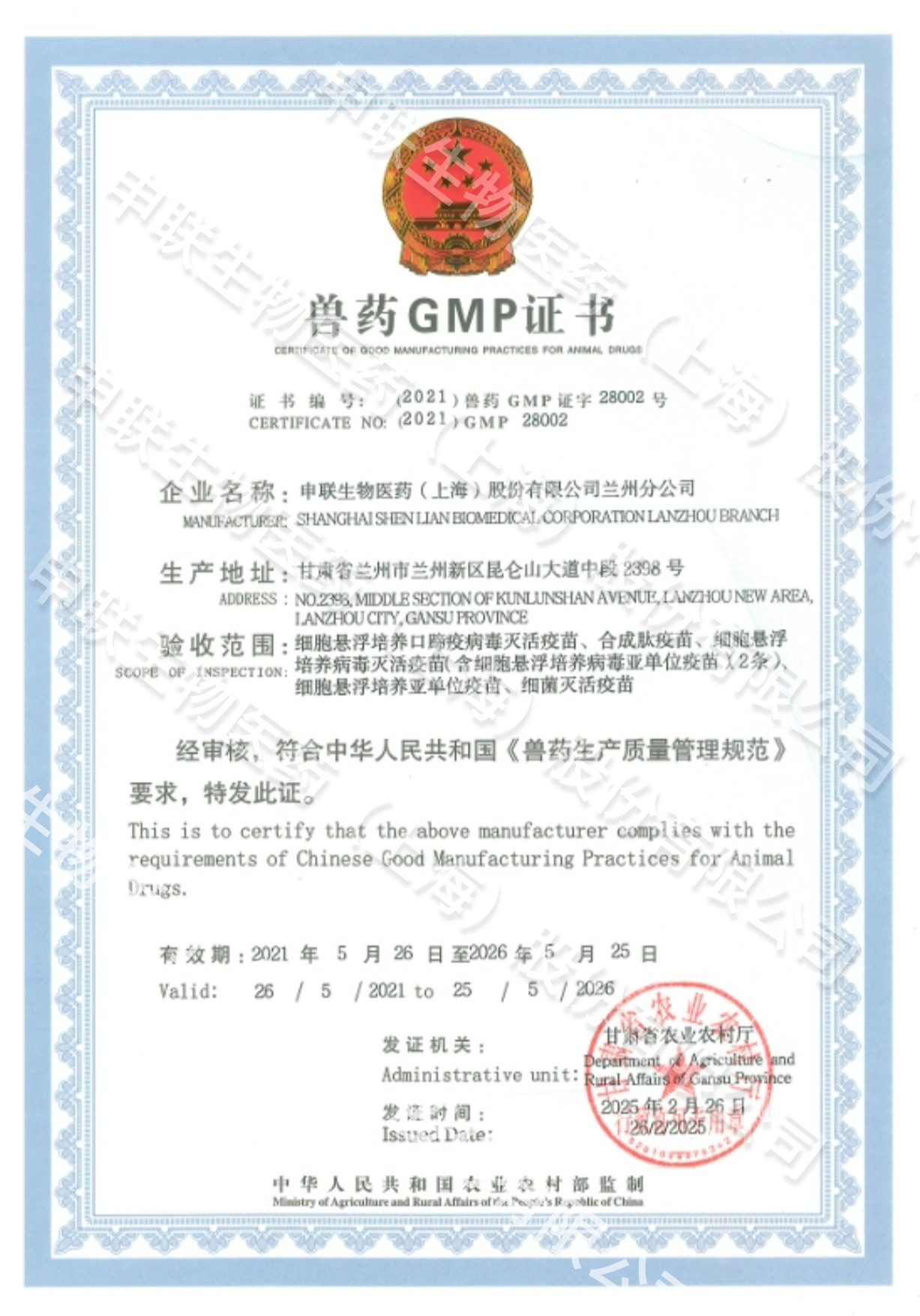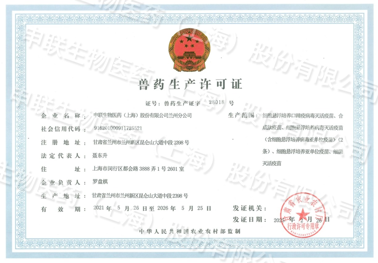2025年2月26日,博天堂网址生物医药(上海)股份有限公司兰州分公司取得甘肃省农业农村厅新核发的《兽药GMP证书》和《兽药生产许可证》。